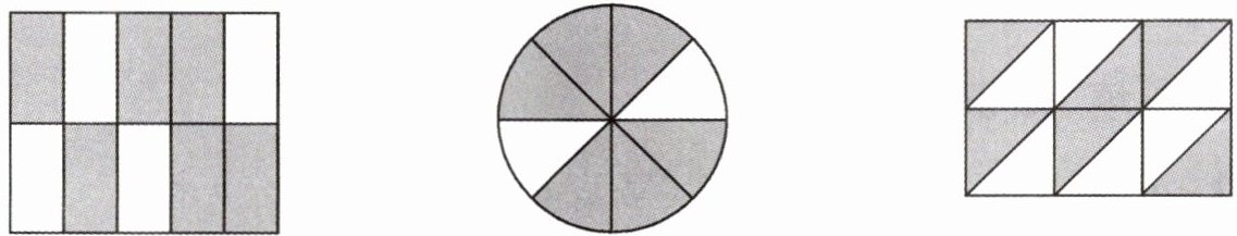 第一个图形中的阴影部分可以用$0.6$表示。因为第一个图形是将整体平均分成$10$份,阴影部分占其中$6$份,$6\div10 = 0.6$;而第二个图形是平均分成$8$份,第三个图形是平均分成$12$份(以三角形为单位),它们的阴影部分占比计算结果都不是$0.6$。