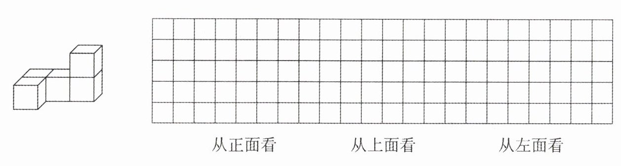 按照上述分析,在方格纸中画出从正面、上面、左面看到的图形(由于无法直接绘制图形,你可根据描述自行绘制,正面:下层画$3$个小正方形横向排列,在最右边小正方形正上方画$1$个小正方形;上面:上层画$3$个小正方形横向排列,下层最左边画1个小正方形;左面:上层最左边画1个正方形,下层画2个小正方形)。