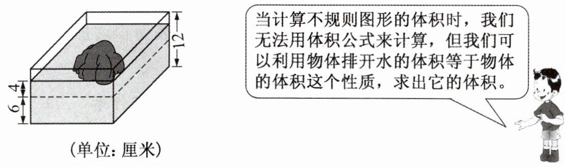 如图,水池的容积是7200毫升,高是12厘米,水池中水面的高度是6厘米。一块石块沉没水中后,水面升高了4厘米。计算这块石块的体积。