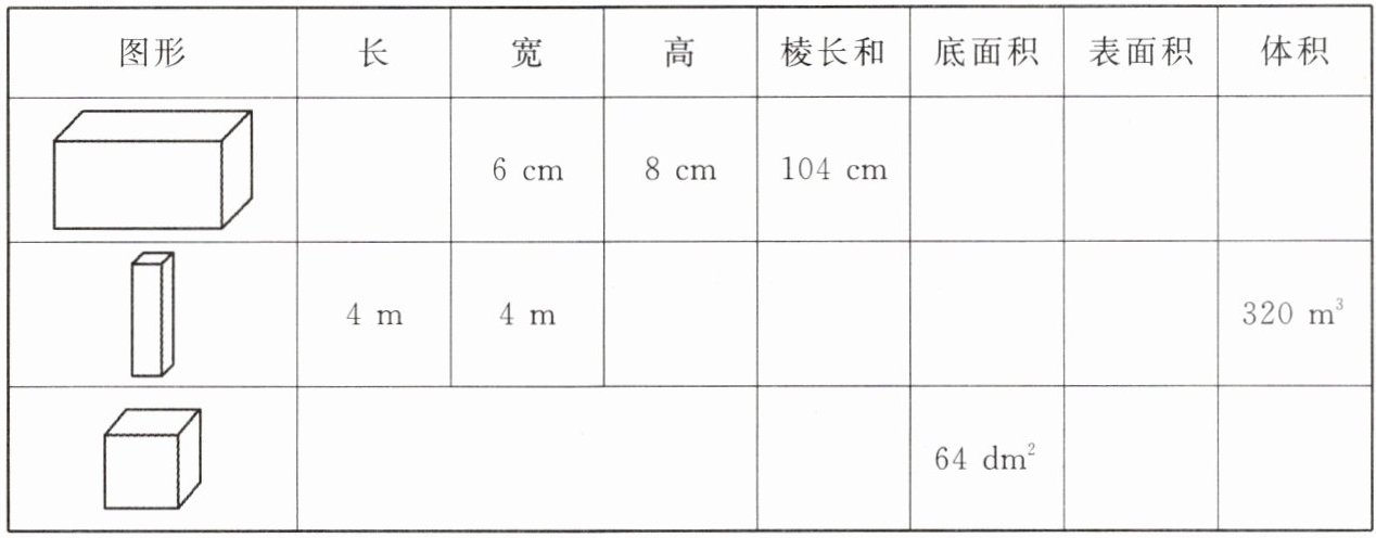 |正方体|$8dm$|$8dm$|$8dm$|$96dm$|$64dm^{2}$|$384dm^{2}$|$512dm^{3}$|