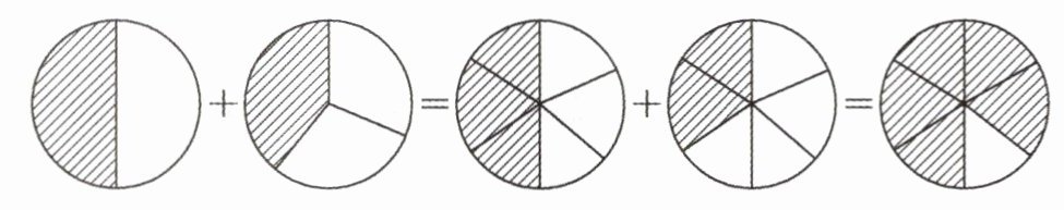 $ \frac { 1 } { 2 } + \frac { 1 } { 3 } = () + () = () $