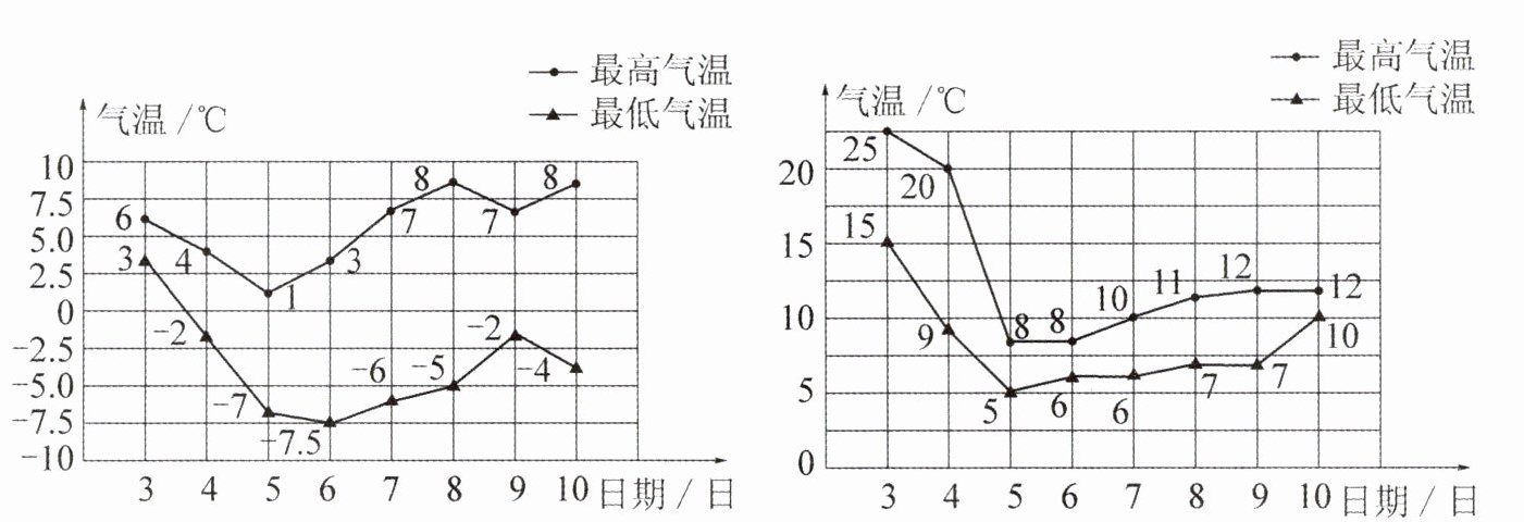 - (2)北京这8天的气温整体较低,最高气温不超过$8^{\circ}C$,最低气温达到$-7.5^{\circ}C$;杭州这8天的气温整体相对较高,最高气温达到$25^{\circ}C$,最低气温也有$5^{\circ}C$。