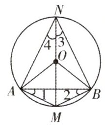 【变式3】如图,在$\odot O$中,直径MN⊥AB.求证:∠1= ∠2= ∠3= ∠4.