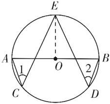 ,$\overset{\frown}{AC}$=$\overset{\frown}{BC}$,∴∠E=$\frac{1}{2}$∠BOC=22.5°,