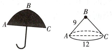 4. 如图(单位:$\mathrm { dm }$),一把打开的雨伞可近似地看成一个圆锥,伞骨(面料下方能够把面料撑起来的支架)末端各点所在圆的直径 $ AC $ 长为 $ 12 \mathrm { dm } $,伞骨 $ AB $ 长为 $ 9 \mathrm { dm } $,那么制作这样的一把雨伞至少需要绸布面料____