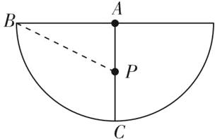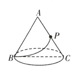8. 如图,$ BC $ 是圆锥底面圆的直径,底面圆的半径为 $ 3 \mathrm { m } $,母线长 $ 6 \mathrm { m } $。若一只小虫从点 $ B $ 沿圆锥的侧面爬行到母线 $ AC $ 的中点 $ P $,则小虫爬行的最短路径长( )