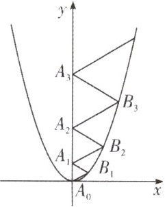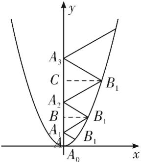 设 A₀A₁ = a,A₁A₂ = b,A₂A₃ = c,则 AB₁ = $\frac{\sqrt{3}}{2}a$,BB₂ = $\frac{\sqrt{3}}{2}b$,CB₃ = $\frac{\sqrt{3}}{2}c$,在等边 △A₀B₁A₁ 中,B₁($\frac{\sqrt{3}}{2}a$,$\frac{a}{2}$),代入 y = $\frac{2}{3}x²$ 中,得 $\frac{a}{2}$ = $\frac{2}{3}$×$\frac{3}{4}a²$,解得 a = 1,即 A₀A₁ = 1,在等边 △A₁B₂A₂ 中,B₂($\frac{\sqrt{3}}{2}b$,$1 + \frac{b}{2}$),代入 y = $\frac{2}{3}x²$ 中,得 $1 + \frac{b}{2}$ = $\frac{2}{3}$×$\frac{3}{4}b²$,解得 b = 2,即 A₁A₂ = 2,在等边 △A₂B₃A₃ 中,B₃($\frac{\sqrt{3}}{2}c$,$3 + \frac{c}{2}$),代入 y = $\frac{2}{3}x²$ 中,得 $3 + \frac{c}{2}$ = $\frac{2}{3}$×$\frac{3}{4}c²$,解得 c = 3,即 A₂A₃ = 3,…以此类推由此可得 △A₂₀₂₄B₂₀₂₅A₂₀₂₅ 的边长为 2025,