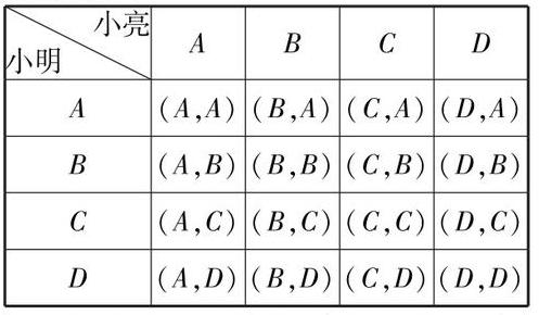 4. 小明和小亮下周日计划各自从看电影(记为A)、郊游(记为B)、去图书馆(记为C)、滑雪(记为D)中任选一项活动参加,每项活动被选中的可能性相同.
