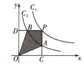 【例题2】双曲线$C_{1}:y= \frac {4}{x}(x>0)和C_{2}:y= \frac {2}{x}(x>0)$的图象如图所示,设点$P在C_{1}$上,$PC⊥x轴于点C$,交$C_{2}于点A$,$PD⊥y轴于点D$,交$C_{2}于点B$,则四边形$OAPB$的面积为(