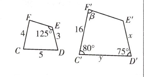 【例题1】如图,四边形CDEF与四边形$C'D'E'F'$相似,求未知边x,y的长度和$∠β$的度数.