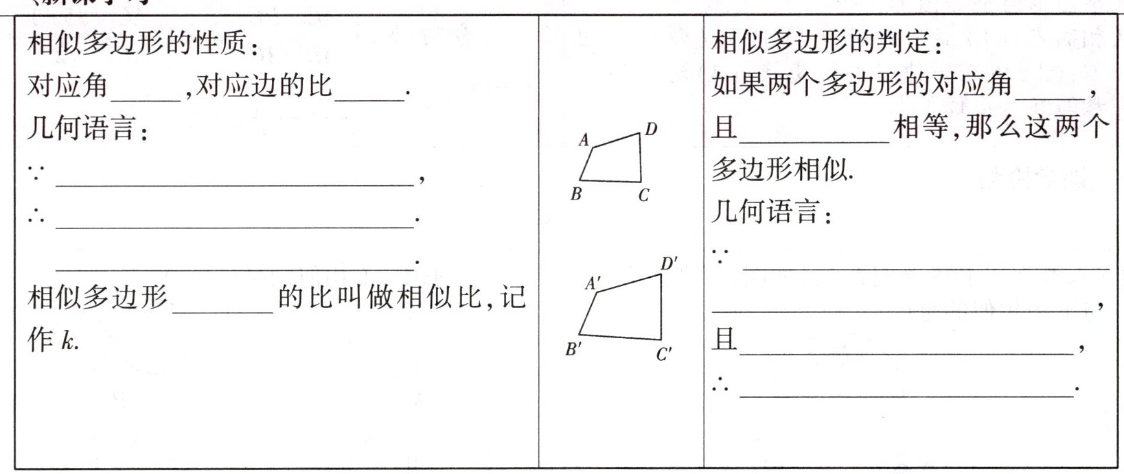 $\angle A = \angle A'$,$\angle B = \angle B'$,$\angle C = \angle C'$,$\angle D = \angle D'$$\frac{AB}{A'B'} = \frac{BC}{B'C'} = \frac{CD}{C'D'} = \frac{AD}{A'D'}$
