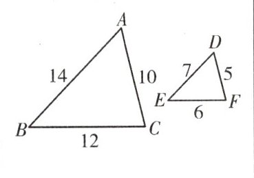 1. 若 $ \triangle ABC \backsim \triangle DEF $,$ AB = 10 $,$ BC = 12 $,$ DE = 5 $,则 $ EF $ 的长为(