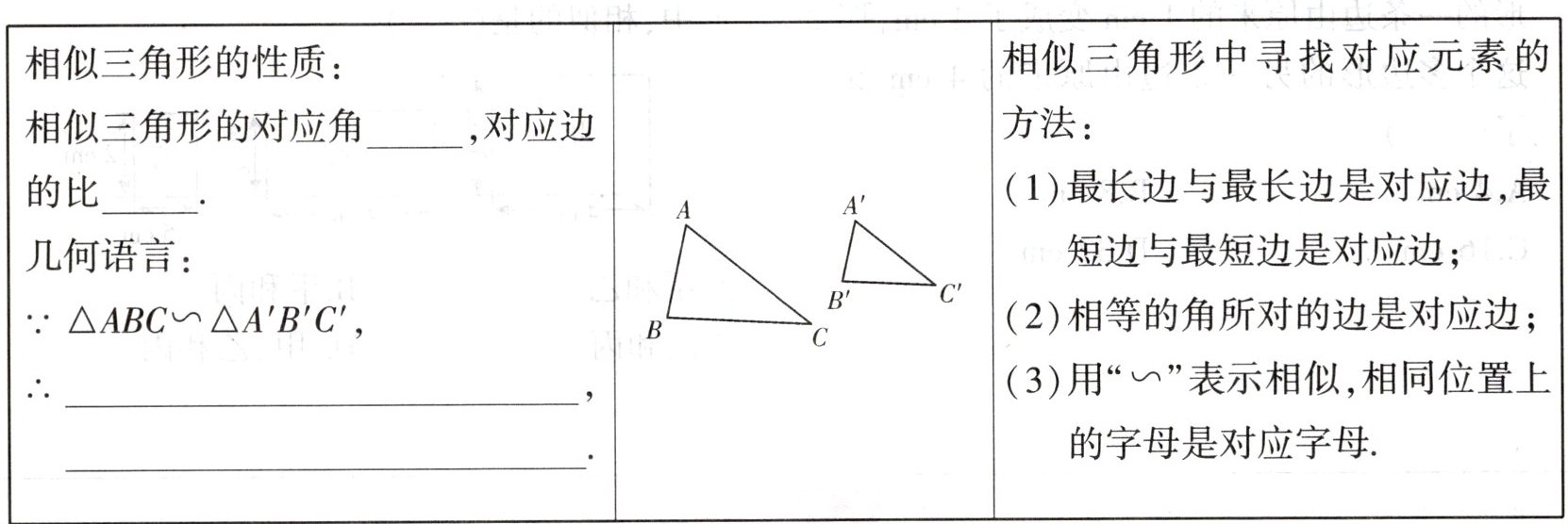 ,对应边$\frac{AB}{A'B'} = \frac{AC}{A'C'} = \frac{BC}{B'C'}$