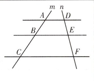 【变式1】如图,$ A D // B E // C F $,直线$ m $,$ n 与这三条平行线分别交于点 A $,$ B $,$ C 和点 D $,$ E $,$ F $,已知$ A B = 5 $,$ B C = 10 $,$ D E = 4 $,则$ E F = $