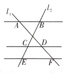 3. 如图,已知$ A B // C D // E F $,它们依次交直线$ l _ { 1 } $,$ l _ { 2 } 于点 A $,$ D $,$ F 和点 B $,$ C $,$ E $,如果$ A D : D F = 3 : 1 $,$ B E = 24 $,那么$ C E $等于(
