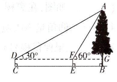 3. (人教九下P81教材改编)如图,小红同学用仪器测量一棵大树AB的高度,在C处测得∠ADG= 30°,在E处测得∠AFG= 60°,CE= 8米,仪器高度CD= 1.5米,求这棵树AB的高度(结果保留一位小数,$\sqrt{3} \approx 1.732$)。
