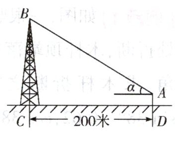 2. 如图,在离铁塔200米的A处,用测倾仪测得塔顶的仰角为α,测倾仪高AD为1.5米,则铁塔的高BC为(