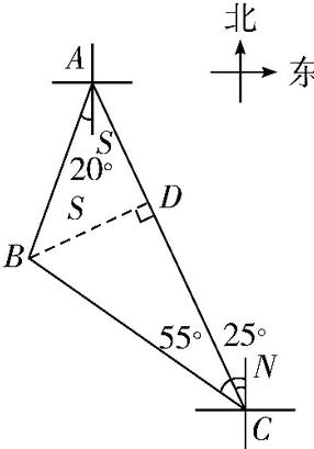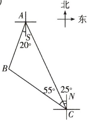 根据题意,得$\angle BAS = 20^{\circ}$,$\angle ACN = 25^{\circ}$,$\angle BCN = 55^{\circ}$,