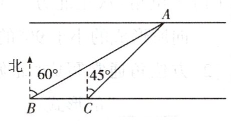 【变式2】如图,一段河流自西向东,河岸笔直,且两岸平行.为测量其宽度,小明在南岸边 $ B $ 处测得对岸边 $ A $ 处一棵大树位于北偏东 $ 60^{\circ} $ 方向,他以 $ 1.5 \mathrm{~m} / \mathrm{s} $ 的速度沿着河岸向东步行 $ 40 \mathrm{~s} $ 后到达 $ C $ 处,此时测得大树位于北偏东 $ 45^{\circ} $ 方向,试计算此段河面的宽度.(结果保留整数,参考数据: $ \sqrt{3} \approx 1.732 $)