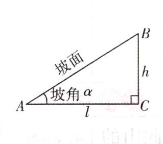(2) 坡角的正切值叫坡度,记作i.即坡度$i= \tan \alpha =\frac {h}{l}$.