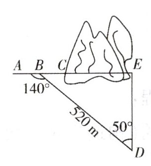 【例题4】(人教九下P76)如图,沿AC方向开山修路。为了加快施工进度,要在小山的另一边同时施工。从AC上的一点B取$\angle ABD = 140^{\circ},BD = 520m,\angle D = 50^{\circ}。$那么另一边开挖点E离D多远正好使A,C,E三点在一直线上(结果保留小数点后一位)?(参考数据:$\sin 50^{\circ}\approx 0.77,\cos 50^{\circ}\approx 0.64,\tan 50^{\circ}\approx 1.19)$