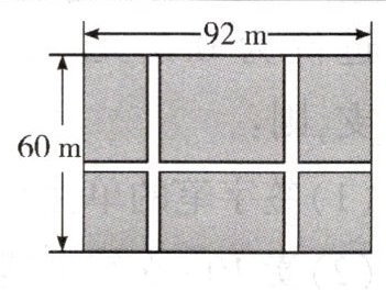 1. 如图,在一块长92m,宽60m的矩形耕地上挖三条水渠(水渠的宽都相等),水渠把耕地分成6个矩形小块(阴影部分),如果6个矩形小块的面积和为$5310m^2,$你知道水渠应挖多宽吗?若设水渠应挖x m宽,则根据题意,下面所列方程中正确的是(