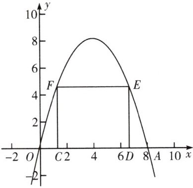 (2)如图,点$C$从点$O$出发,沿$x$轴以每秒钟$1$个单位的速度运动,矩形$CDEF$内接于抛物线,$C$,$D$在$x$轴上,$E$,$F$在抛物线上,运动时间$t(0<t<4)$为何值时,内接矩形$CDEF$的周长最长?并求周长的最大值;