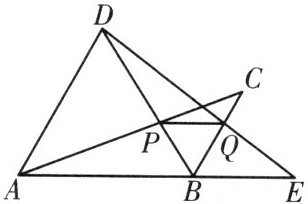 6.如图,将$△ABC$绕点B顺时针旋转$60^{\circ }$得到$△DBE$,点C的对应点E恰好落在AB的延长线上,连接AD,AC与DB交于点P,DE与CB交于点Q,连接PQ,若$AD=5cm,\frac {PB}{AB}=\frac {2}{5}$,求PQ的长.
