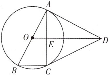 12.如图,四边形ABCD中,$AB=AD=CD$,以AB为直径的$\odot O$经过点C,连接AC,OD相交于点E,若$AC=2BC$,求证:DC与$\odot O$相切.