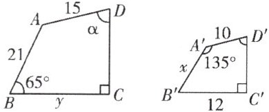 6. 如果四边形 ABCD 与四边形 $A'B'C'D'$ 相似, 且 $CD⊥BC,C'D'⊥B'C',∠B = 65^{\circ},∠A' = 135^{\circ}$, 根据图中的条件, 求出未知的 $x,y$ 及 $∠α$.
