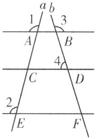 5.如图,直线$AB$,$CD$,$EF$被直线$a$,$b$所截,若$∠1=100^{\circ }$,$∠2=100^{\circ }$,$∠3=125^{\circ }$,$∠4=55^{\circ }$,下列结论错误的是(