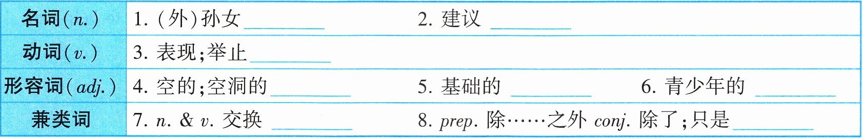 |形容词(adj.)|4. 空的;空洞的 ______|5. 基础的 ______|6. 青少年的 ______|