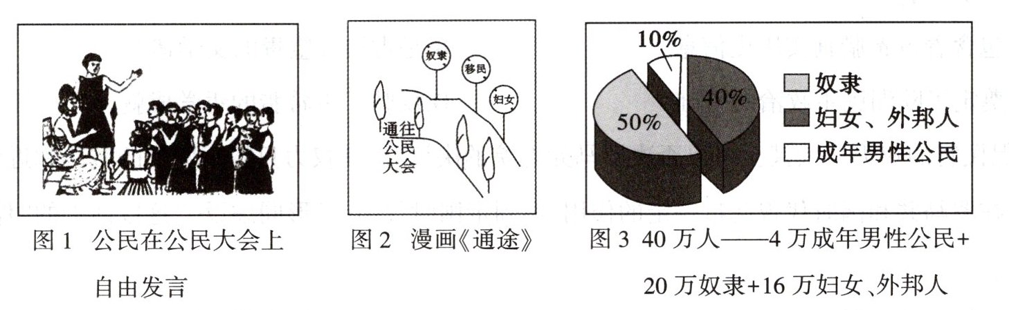 (2) 古代雅典盛行民主政治,但是城邦的实权掌握在少数奴隶主手中,享有民主的是雅典城邦的成年男性公民,占雅典人口绝大多数的外邦人、奴隶、妇女没有任何政治权利。(其他答案言之有理亦可,4分)