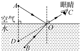 解析:小鸟在水面所成的像为平面镜成像,根据平面镜成像的特点,像与物关于平面镜对称,作出A的对称点D即为A的像,连接DC与界面的交点O为入射点,此时OC为反射光线,画出入射光线AO;鱼的像与鸟的重合,故D也是鱼的像,过B点画出入眼看到鱼的入射光线BO.