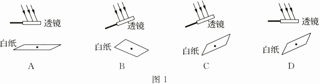 (1)小明利用太阳光测量凸透镜焦距,如图1所示,操作最合理的是____(填字母)。小明适当调整位置后,当在白纸上出现一个____的光斑时,测出其焦距。
