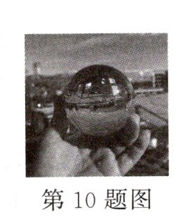 10.(2025·陕西模拟·3分)如图所示,小明手拿水晶球,透过水晶球可以看到建筑物倒立、____(选填"放大"或"缩小")的像,水晶球相当于____透镜,此时成像原理与生活中的____(选填"照相机""投影仪"或"放大镜")原理相同.