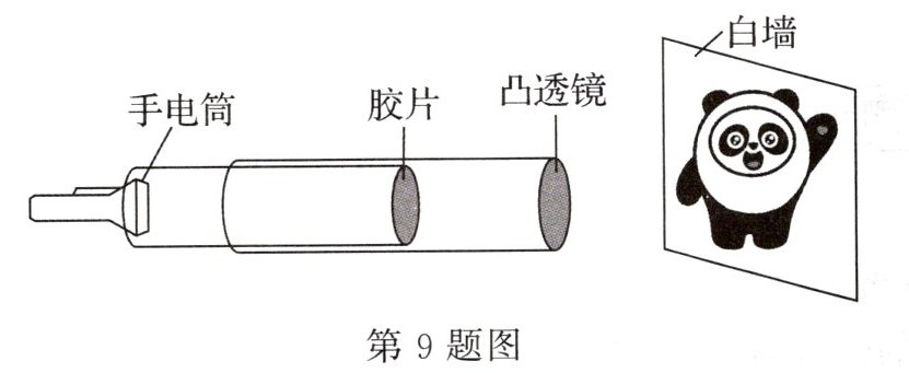 9.(2025·北京期末·2分)上分点三 小东自制了一个简易投影仪,它主要由手电筒、内筒(一端开口,另一端可以放置胶片)、外筒(一端开口,另一端固定凸透镜)组成,内筒可嵌于外筒且能左右推动.将印有"冰墩墩"的透明胶片贴于内筒一端,打开手电筒,调整胶片、凸透镜到白墙的位置,在墙上得到清晰放大的像,如图所示.已知凸透镜的焦距是10cm,下列说法正确的是 ()