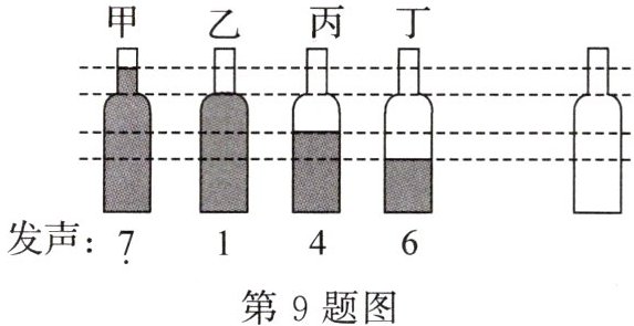 9.新考法 物理绘图(3分)上分点三 如图所示,四个相同的瓶子中注入不等量的水,用筷子从左向右依次敲击,它们发出声音的音调逐渐上升(简谱…“6 7 1 2 3 4 5 67…”的发声中,音调从低到高).
