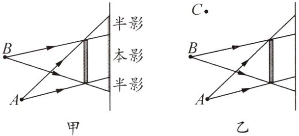 (2)如果在图乙中放上第三支蜡烛C照到书上,光线完全照射不到的地方就会减小,则在墙上产生的本影部分会逐渐缩小.