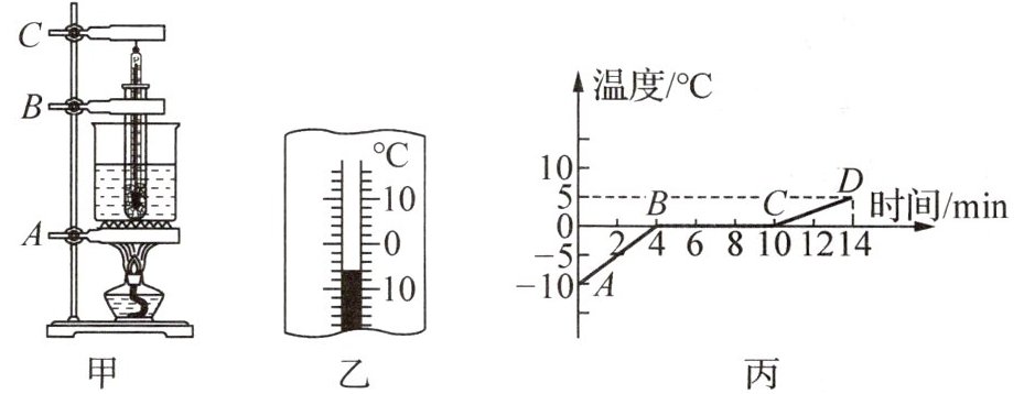 (1)使物质受热均匀 (2)试管底碰到了烧杯底 (3)$-6$ (4)$0$ 解析:(1)小聪先将碎冰放入试管中,再将试管放入烧杯中加热,目的是使物质受热均匀.(2)由图甲可知,安装的不足之处是试管底碰到了烧杯底.(3)分析图乙可知,温度计的分度值为$2^{\circ}C$,则其示数为$-6^{\circ}C$.(4)由图丙可知,该物质在$4\sim10min$,吸收热量,温度保持$0^{\circ}C$不变,所以该物质的熔点为$0^{\circ}C$,物质的凝固点与熔点相同,所以该物质的凝固点也是$0^{\circ}C$.
