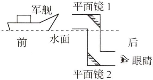 9. 如图是潜望镜的示意图,观察者通过该潜望镜看到的物体的像的情况是:同实际物体上下______、左右______(前两空均选填“一致”或“相反”).人眼看到军舰的像到潜望镜的距离______(选填“大于”“等于”或“小于”)军舰到潜望镜的距离.
