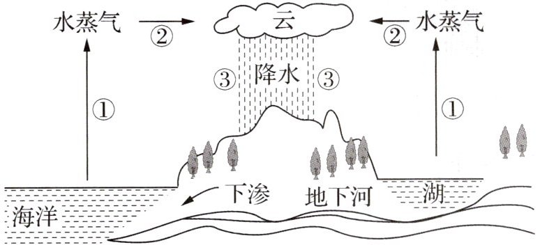 典例4 (2025·天津期末)如图所示的是地球上水循环的示意图. 图中①处发生的物态变化伴随着______(选填“吸热”或“放热”);图中②处水蒸气有的形成小水滴,有的形成小冰晶,形成千姿百态的云;图中③处温度较高时冰晶会______(填物态变化名称)变成水滴,与空中的小水滴一起形成雨.