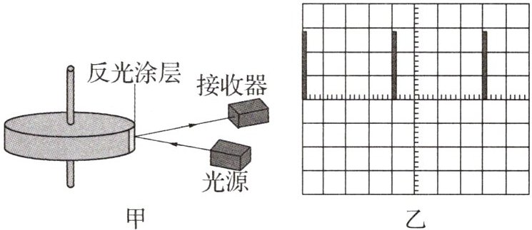 11.利用激光测转速的原理如图甲所示,图中圆盘可绕固定轴转动,圆盘边缘侧面上涂有一小段很薄的反光材料,当圆盘转到某一位置时,接收器可以接收到反光涂层所反射的激光束,并将所收到的光信号转变成电信号,在示波器显示屏上显示出来(如图乙所示),若图乙中示波器显示屏横向的每大格(5小格)对应的时间为 $ 5 × 10^{-2} \text{ s} $,则圆盘的转速为____ $ \text{r/s} $.