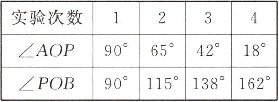 (3)由表中实验数据可知,入射光线与镜面的夹角$\angle AOP$逐渐变小,入射光线$AO$与法线$ON$的夹角即入射角逐渐变大,因此入射光线$AO$逐渐远离法线$ON$;由表中实验数据可知,$\angle AON=90^{\circ}-\angle AOP=\angle POB - 90^{\circ}=\angle NOB$,反射角$\angle NOB$与入射角$\angle AON$的大小相等。