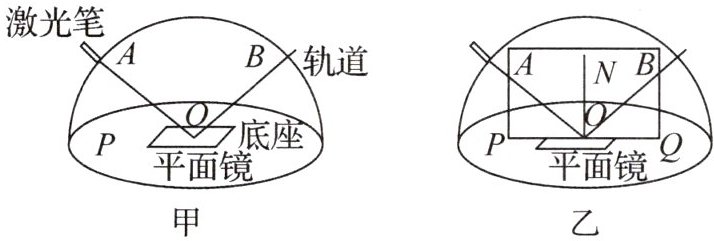 (2)多次改变激光笔在轨道上的位置,小红调整视角,均能观察到反射光 $ OB $ 挡住入射光 $ AO $ 的现象,如图乙所示,将长方形纸板与 $ AO $、$ OB $ 所在平面重合,其底边 $ PQ $ 紧贴平面镜,在纸板上即可显示出入射光和反射光,多次测量纸板和平面镜的夹角.