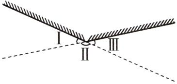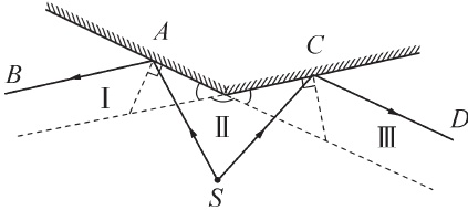 Ⅱ Ⅰ、Ⅱ、Ⅲ 解析:由图可知,物体在Ⅰ或Ⅲ区域时,只能通过镜面的左侧或右侧部分成像,即物体只能成一个虚像;在Ⅱ区域时,可以通过镜面的左侧和右侧部分同时成像,即可以产生两个虚像。由图可知,当人在Ⅰ区域时,不能看见平面镜右侧所成的虚像;人在Ⅲ区域时,不能看见平面镜左侧所成的虚像。如下图,在Ⅱ区域的任意一发光点$S$,经两个反射面反射后的反射光线$AB$、$CD$不能相交于一点,所以在Ⅱ区域也不能同时看到两个虚像,故Ⅰ、Ⅱ、Ⅲ区域均不能同时看到两个虚像。