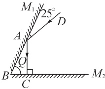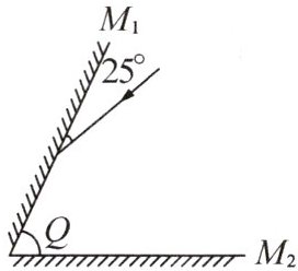 射后沿原路返回,则平面镜 $ M_1 $ 与 $ M_2 $ 之间的夹角 $ Q $ 应为____.若平面镜 $ M_1 $ 绕入射点逆时针转动 $ 25^\circ $,入射光线不变,则第一次入射光线与第一次反射光线夹角变化____.