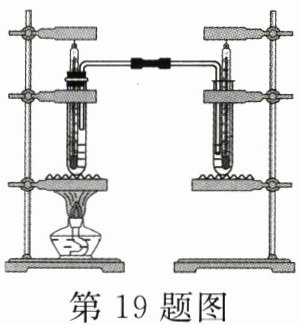 19. 如图所示,在两个大试管中分别加入三分之一的水,给左边的试管加热,把水沸腾产生的水蒸气引导到右边试管的冷水中,则冷水中的温度计示数会____,冷水会变多,说明水蒸气进入冷水中遇冷发生了____(填物态变化名称)现象;装置中左边石棉网的作用是使试管底部受热____。
