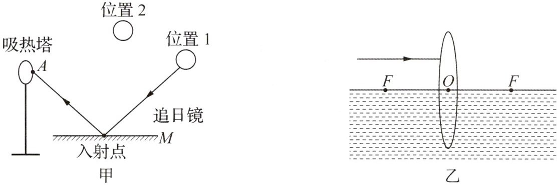 (1)光热电站利用追日镜(平面镜)将太阳光反射到吸热塔用于发电.如图甲,当太阳从位置1运动到位置2时,如何绕入射点旋转追日镜(平面镜)M才能使太阳光恰好反射到吸热塔的A点呢?请在图中画出太阳运动到位置2时,追日镜(平面镜)M所在的位置并补全光路.