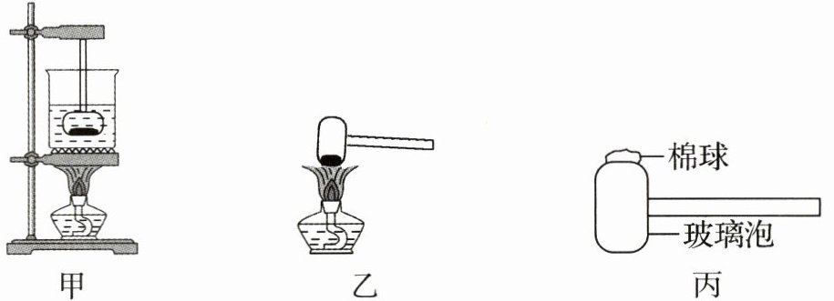 (3)将碘锤从热水中取出,其内壁会出现紫黑色的碘颗粒,这是碘蒸气____(填物态变化名称)形成的。小勇将一个浸满酒精的棉球放置在刚从热水中取出的碘锤玻璃泡上方(如图丙),请预测将会出现的现象:____。